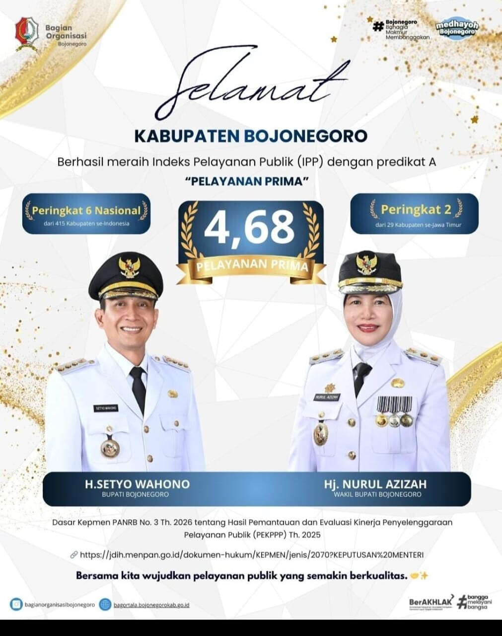 Pemerintah Kabupaten Bojonegoro menyampaikan apresiasi dan rasa syukur atas capaian Indeks Pelayanan Publik (IPP) dengan predikat A (Pelayanan Prima) pada hasil Pemantauan dan Evaluasi Kinerja Penyelenggaraan Pelayanan Publik (PEKPPP) Tahun 2025. Dengan nilai 4,68, Kabupaten Bojonegoro berhasil meraih peringkat ke-6 nasional dari 415 kabupaten se-Indonesia serta peringkat ke-2 se-Jawa Timur.