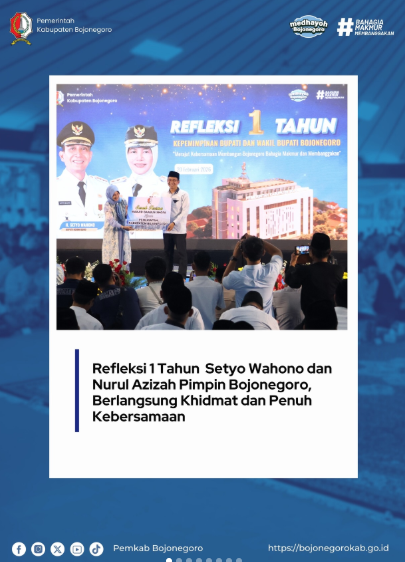 Refleksi ini bukan sekadar seremoni, melainkan wujud komitmen untuk terus menghadirkan pemerintahan yang responsif, melayani, dan berpihak pada kepentingan rakyat. Berbagai program prioritas di bidang pelayanan publik, pembangunan infrastruktur, penguatan ekonomi daerah, pendidikan, dan kesejahteraan sosial menjadi bagian dari langkah strategis menuju Bojonegoro yang lebih maju.