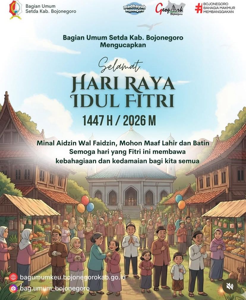 Bagian Umum Setda Kabupaten Bojonegoro mengucapkan Selamat Hari Raya Idul Fitri 1447 H / 2026 M. Momentum suci ini menjadi waktu yang tepat untuk saling memaafkan, mempererat silaturahmi, serta menumbuhkan kembali semangat kebersamaan. Dengan hati yang bersih, mari kita songsong hari yang fitri dengan penuh harapan, kedamaian, dan kebahagiaan bagi seluruh masyarakat.